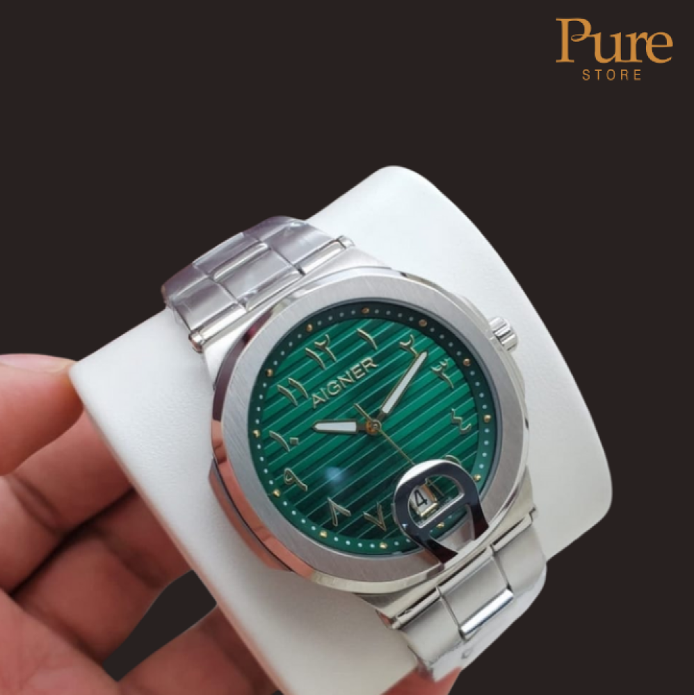 ارتقِ بإطلالتك مع هذه الساعة الرجالية الفاخرة من AIGNER، التي تجمع بين البساطة والتميّز في تصميم عصري يجذب الأنظار. المينا باللون الأخضر الغني مع التفاصيل الدقيقة يجعلها قطعة استثنائية تضيف لمسة من الرقي لكل من يرتديها.